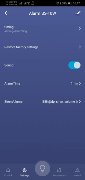 + “Settings” Cài đặt thời gian bật tắt Arming/Disarming, âm lượng còi báo động, thời gian báo động, âm báo trên điện thoại, khôi phục lại cài đặt gốc.